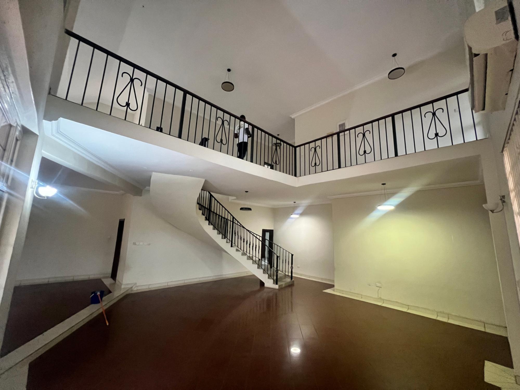 Road side four bed house with a 2 bedrooms BQ Found right at the main road It has a very lard compound with Garden It can be used for commercial or family residential purpose It’s a storey building It has AC in alll rooms Self meter Water available